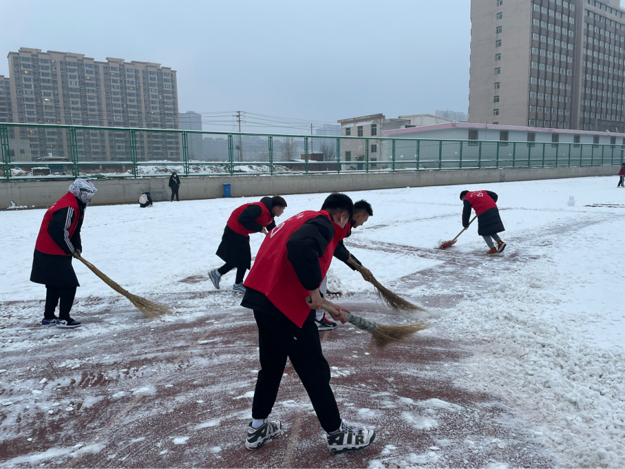 在学院老师的带领下,同学们顶着寒风,拿着铁锹和扫帚清扫积雪,充分发扬团结合作、吃苦耐劳的奉献精神,用最快的速度将积雪清扫干净。