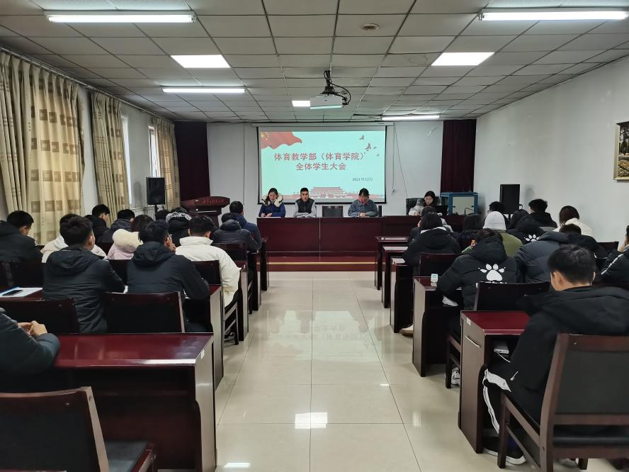 2021年12月27日下午,在体育馆二楼多媒体教室开展2021年度体育教育系全体学生大会,会议由党总支副书记(副院长)武淑琴主持,学工办老师杨乐、闫智惠、王梦茹参加会议。