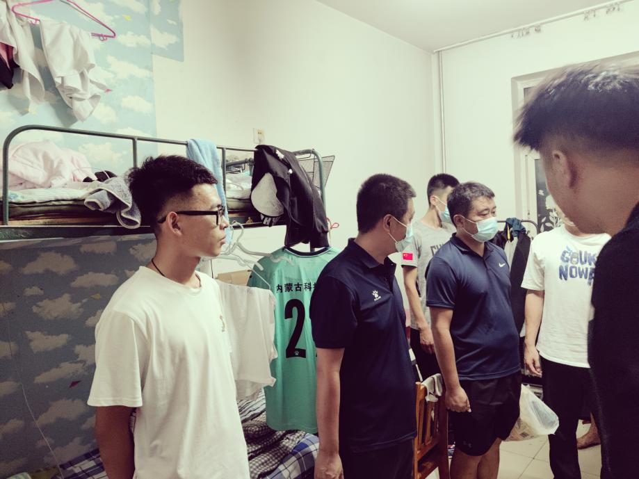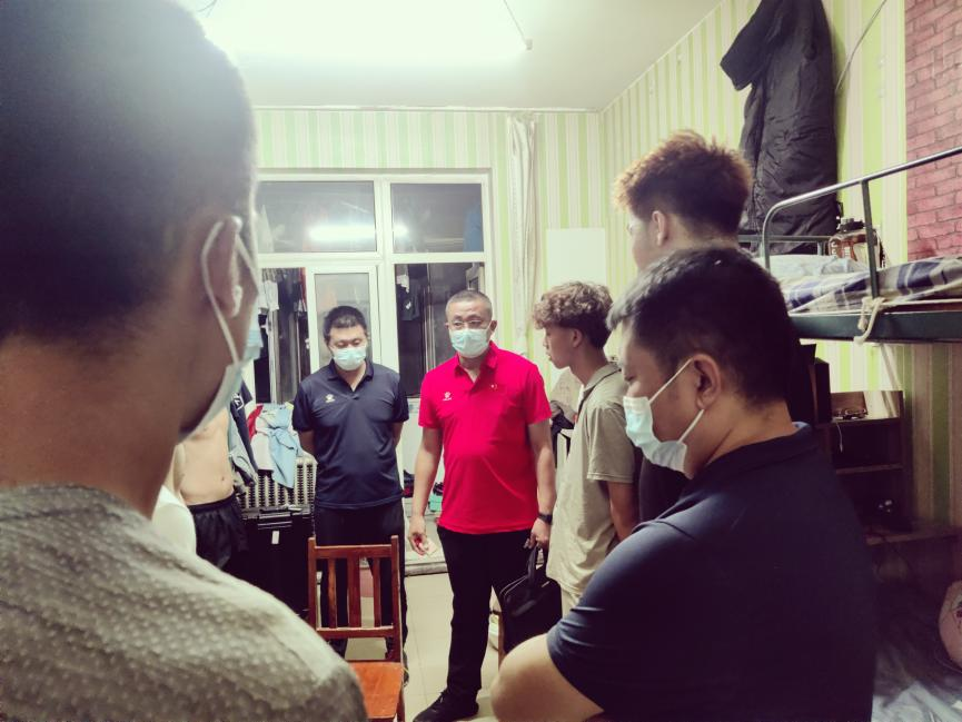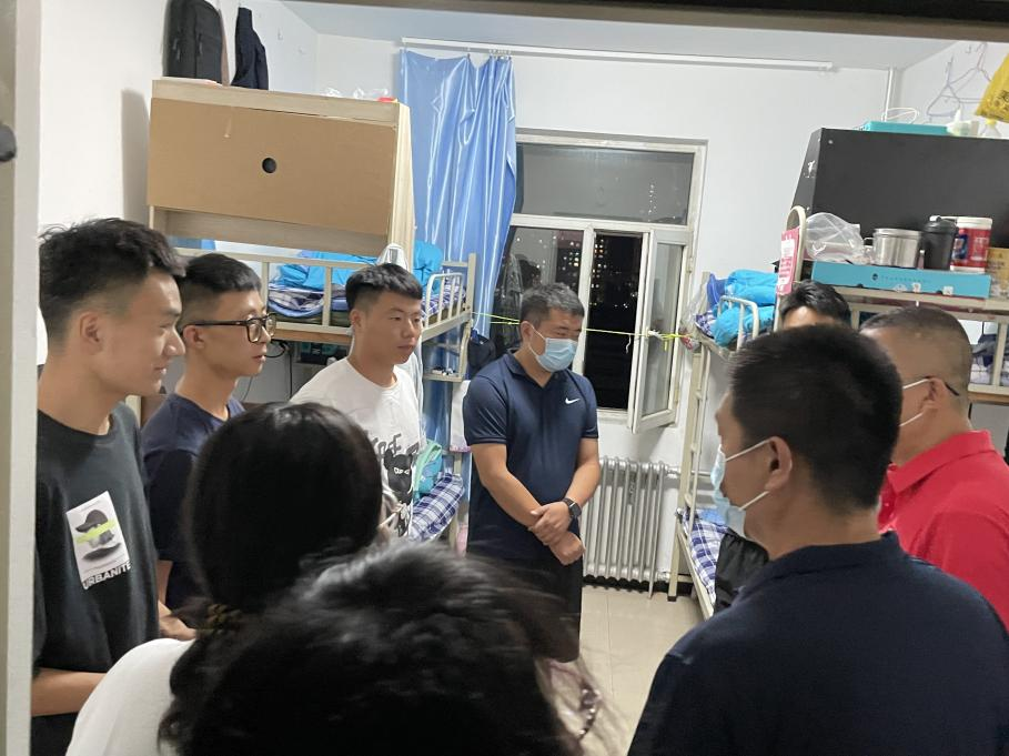 2022年8月20日晚,yl7703永利集团党总支书记苗凯、院长白楠、党总支副书记武淑琴、体育教育系主任王丰、学工办主任杨乐、团总支老师王梦茹深入学生宿舍慰问学生。