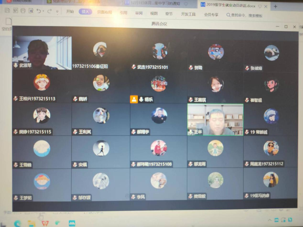 2022年11月30日晚,yl7703永利集团以腾讯会议的形式召开了2019级学生就业工作推进会议,学院党委副书记武淑琴、系主任王丰、学工办主任杨乐、团总支负责人王梦茹,以及2019级全体学生参加了会议,杨乐老师主持会议。