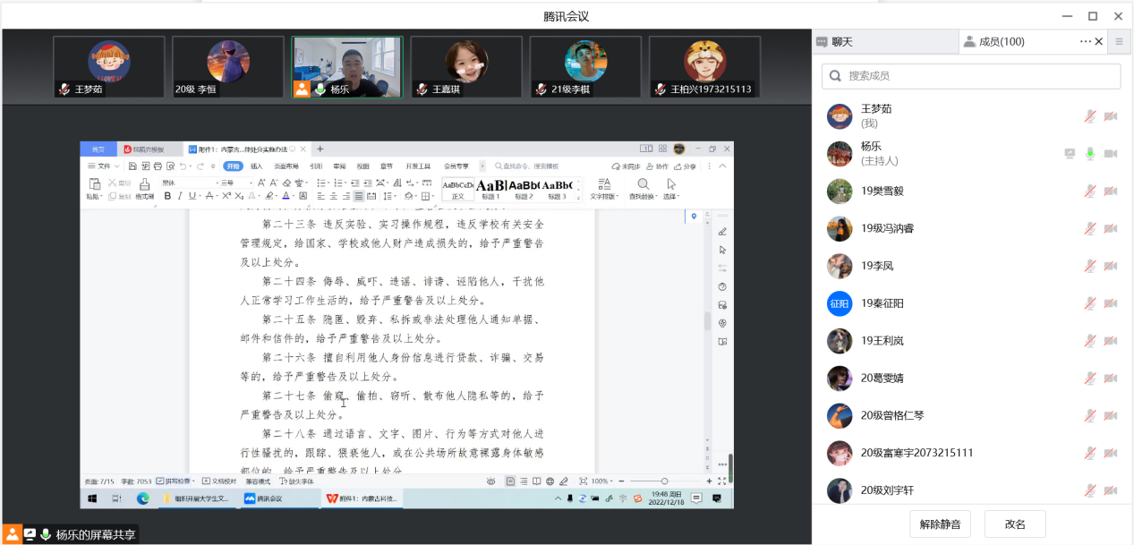 会议开始,杨乐老师带领全体同学重新学习了《永利集团学生纪律处分实施办法》、《永利集团疫情防控期间学生纪律处分暂行规定》、《永利集团学生考试违纪处理细则》等法规制度,结合典型案例做好警示教育,促进学生知规矩、守纪律。