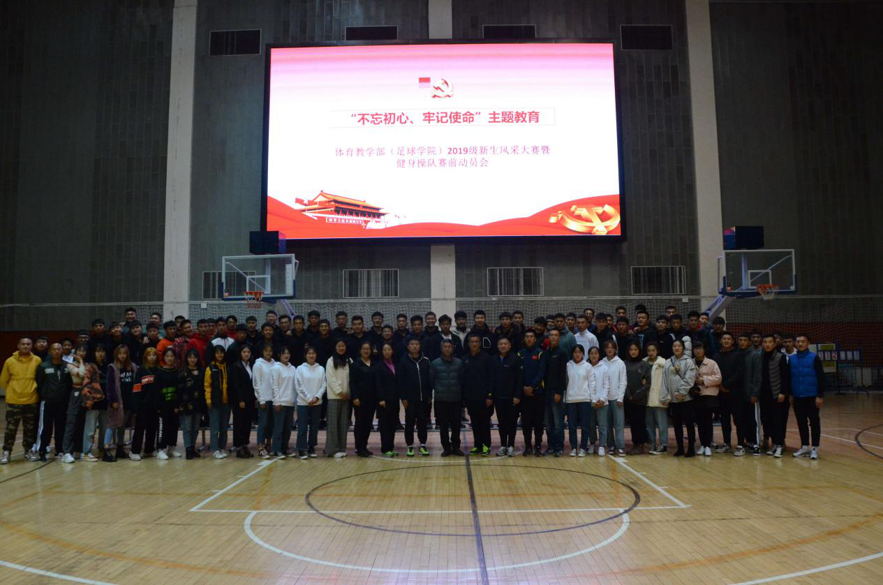 为教育引导广大青年学生不断涵育道德情操,积淀文化底蕴,厚植爱国情怀,激发实现中华民族伟大复兴的奋斗精神,结合“不忘初心、牢记使命”主题教育安排,11月8日晚,体育教学部(足球学院)在体育馆二楼开展“不忘初心、牢记使命”2019级团支部风采大赛暨健身操队赛前动员会。