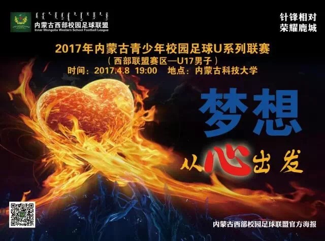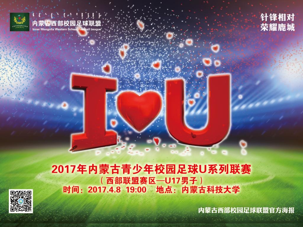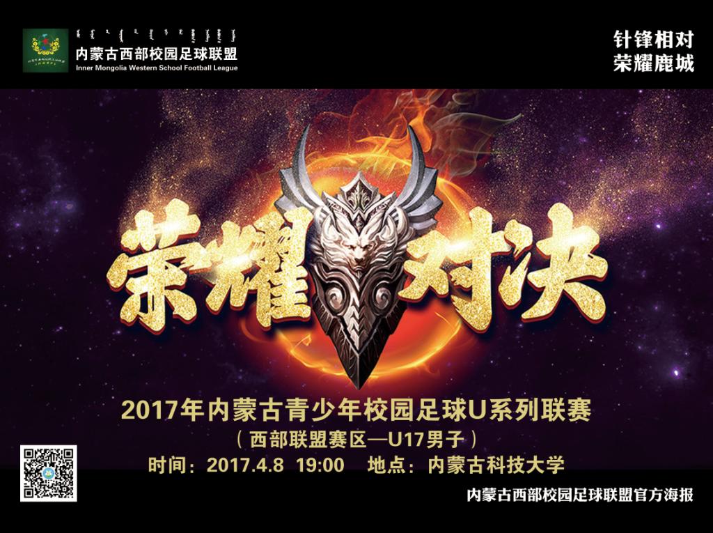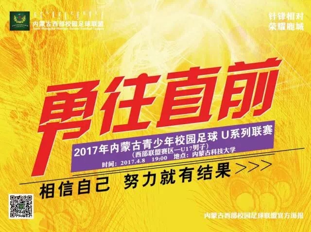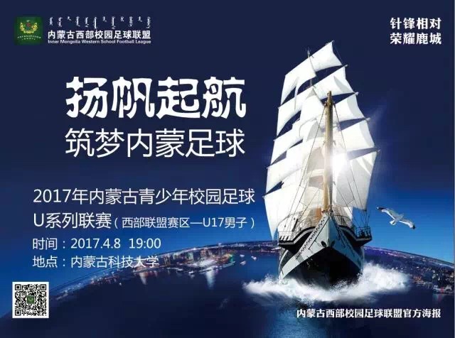 4月8日19:00分,2017年内蒙古自治区校园足球“西部联盟杯”校园足球联赛(U17男子组)揭幕战将在永利集团主校区体育场举行,对阵双方由包头市主场迎战巴彦淖尔市。本次比赛由内蒙古自治区校园足球工作领导小组办公室主办,内蒙古西部校园足球联盟、包头市教育局、乌海市教育局、巴彦淖尔市教育局、阿拉善盟教体局承办,内蒙古自治区中学生体育协会、内蒙古校园足球联合会协办。