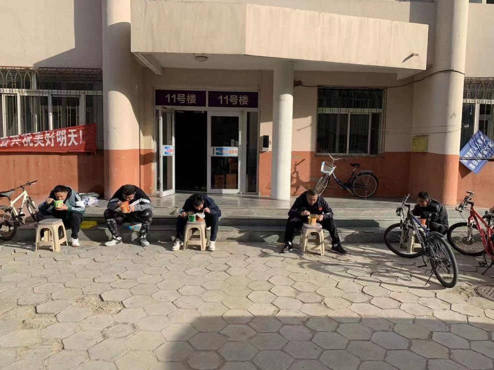 (图7 早餐配送完毕后,老师们在包联楼门口台阶上吃早餐)