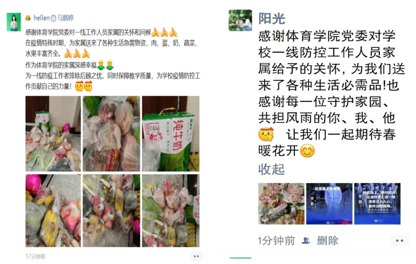 自本轮疫情发生以来,yl7703永利集团第一批住校教师及工作人员已连续工作近20天,在当前疫情防控的紧张形势下,学院党委以线上配送的方式,分别对抗疫一线工作人员家属进行了慰问,为他们送去了牛奶、鸡蛋、肉类、蔬菜、水果等慰问品。