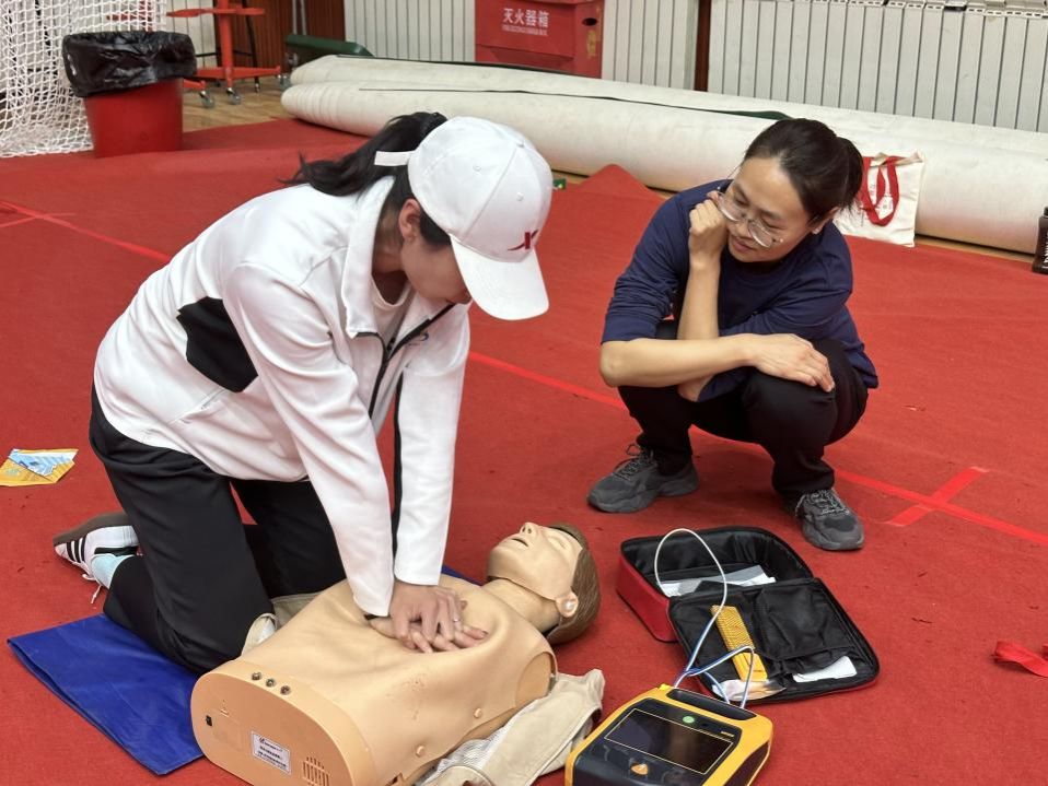 在培训过程中,心肺复苏(CPR)和AED使用的教学成为重点内容之一。讲师详细讲解了心肺复苏的操作步骤,从评估现场环境、判断患者意识和呼吸,到胸外按压的正确位置、深度和频率,以及人工呼吸的技巧,都一一进行了演示。师生们认真聆听,并在模拟人上进行反复练习,讲师在旁耐心指导,纠正不规范的动作,确保每位参与者都能熟练掌握这一关键的急救技能。