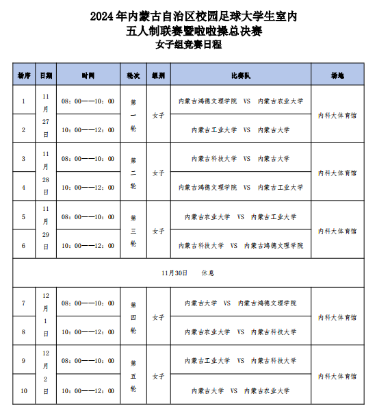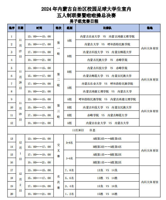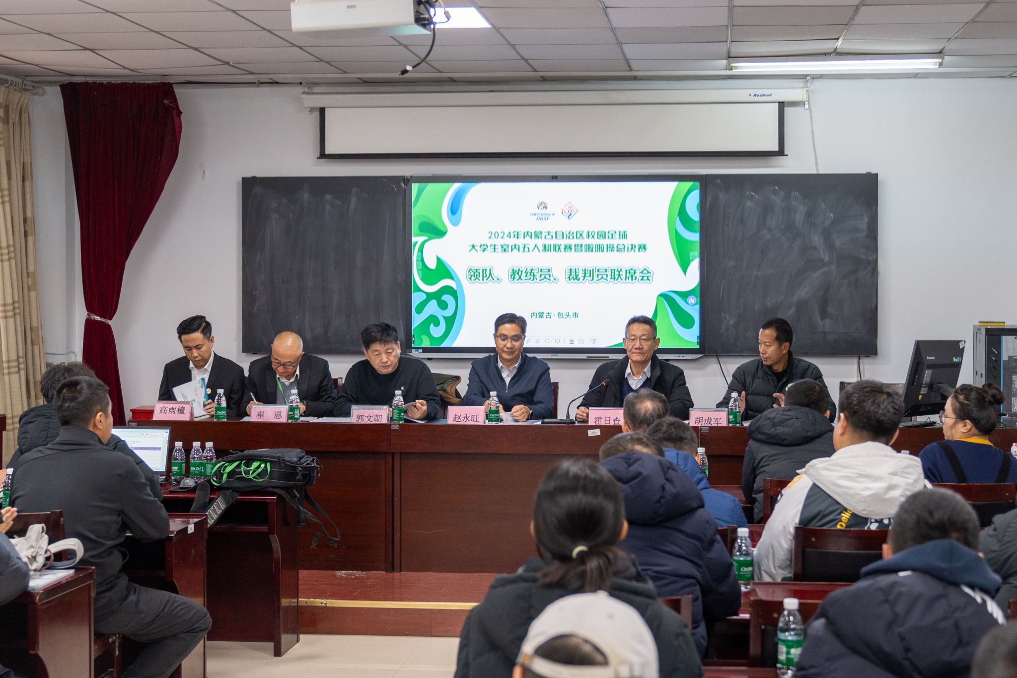 2024年11月25日,2024年内蒙古自治区校园足球大学生室内五人制联赛暨啦啦操总决赛赛前联席会在永利集团体育馆召开。永利集团党委委员、副校长赵永旺,自治区教育厅体育卫生与劳动教育处副处长郭文朝,内蒙古学生体育协会会长霍日查,内蒙古学生体育协会副会长赵生宝,室内五人制足球比赛监督崔恩,室内五人制足球比赛裁判长胡成军,啦啦操比赛裁判长高雨橦,各参赛队伍领队、教练员参会,会议由霍日查主持。