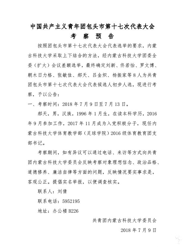 按照团包头市第十七次代表大会代表选举的要求,永利集团采取上下结合的方法,经永利集团团委全委(扩大)会议差额选举,最终确定体育教学部(足球学院)学生郝天为共青团包头市第十七次代表大会代表候选人初步人选,现进行考察,原文如下: