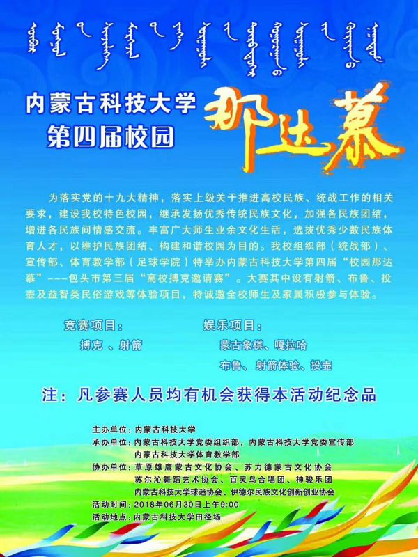 为全面贯彻党的十九大精神,落实上级有关部门关于推进高校民族、统战工作的相关要求。2018年6月30日上午9:00,永利集团将举办第四届“校园那达慕”暨包头市第三届高校搏克邀请赛。该赛事由永利集团党委组织部(统战部)、党委宣传部(新闻中心)、体育教学部(足球学院)联合举办,旨在建设特色校园,继承发扬优秀传统民族文化,加强各民族团结,增进各民族间情感交流,丰富广大师生员工业余文化生活,增强大学生课外体育锻炼的同时,选拔优秀少数民族体育人才,为学校的少数民族体育事业蓬勃发展贡献力量。