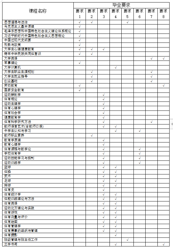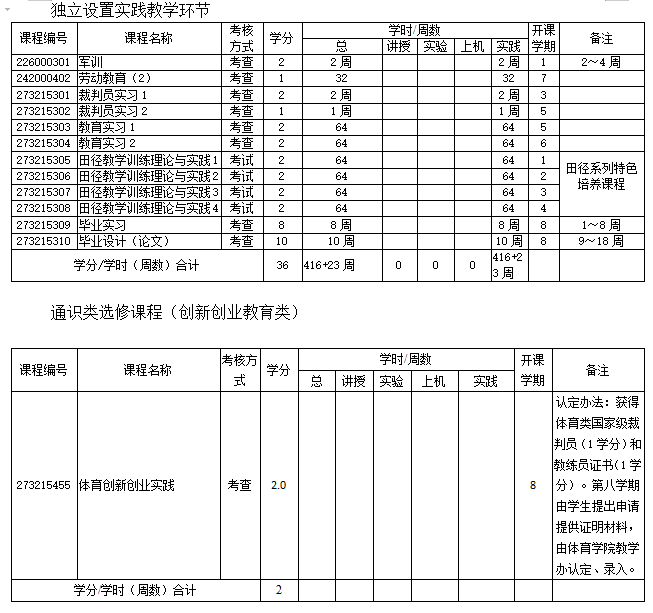 2、主要实践环节:裁判员实习(1、2)、教育实习(1、2)、田径教学训练理论与实践(1-4)、毕业实习、毕业设计(论文)