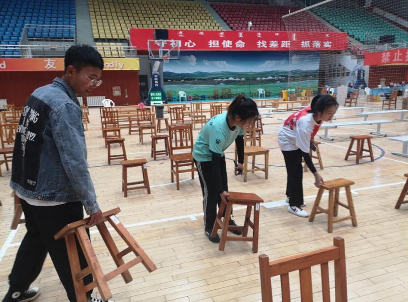 志愿服务分为两部分,一部分同学有序摆放留观区座椅,另一部分同学对体育馆室外台阶处的烟头、纸屑、塑料瓶等垃圾进行清理。